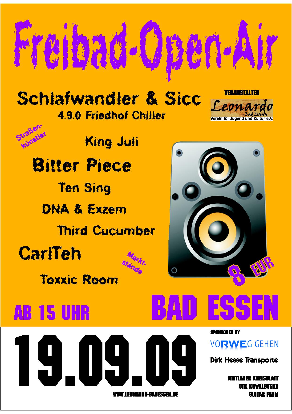 auch diese Jahr veranstaltet der Leonardo – Bad Essen – Verein für Jugend und Kultur e.V. wieder ein Open Air Festival am Freibad Bad Essen. Das Open Air findet für Jung und Alt am Samstag, den 19.09.2009 ab 15:00 Uhr statt. Das Line Up bilden Künstler bzw. Bands aus Bad Essen, dem Landkreis und der Stadt Osnabrück sowie Acts aus Bielefeld und Münster. Die musikalischen Stilrichtungen der Bands reichen von Reagge und Pop über, Dancehall und Hip Hop bis hin zu Rock und Metal. Eine bunte Mischung für jeden Musikgeschmack. Der Eintritt kostet im Vorverkauf 5,00 € und an der Abendkasse 8,00 €. Karten sind ab Anfang August in der Touristinfo, beim Wittlager Kreisblatt und bei mir (Nils Bollhorn – Jugendbetreuer 😉 im Büro Haupt- und Realschule erhältlich.