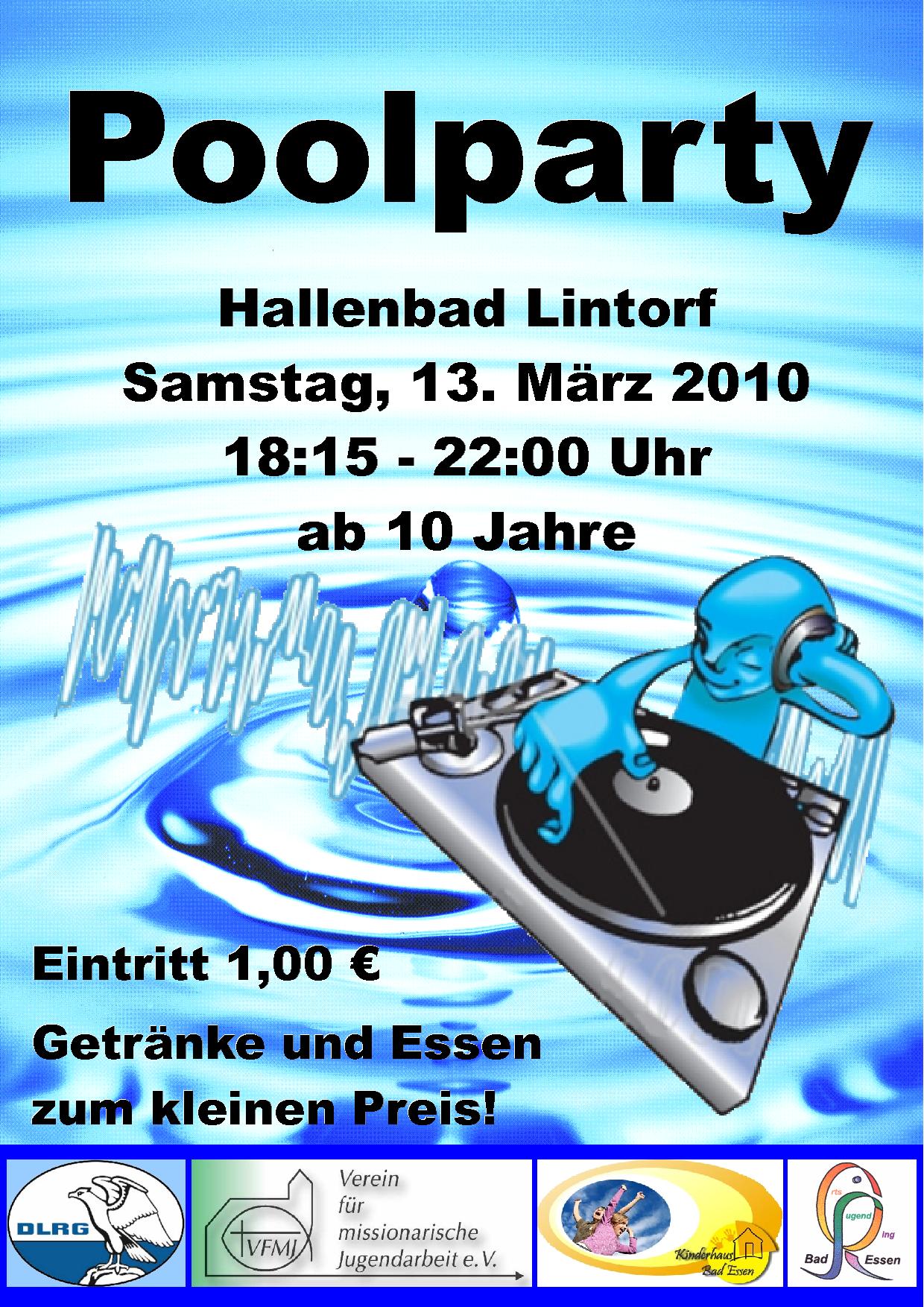packt die Badehose bzw. den Badeanzug ein, denn am Samstag, den 13.03.2010 findet von 18:15 – 22:00 Uhr die zweite Poolparty im Hallenbad Lintorf statt. Der Ortsjugendring Bad Essen, der Verein für missionarische Jugendagrbeit, die DLRG Obere Hunte und ich organisieren für euch wieder eine Disko im Hallenbad. Der Eintritt kostet 1,00 € und Snacks und Getränke sind zum kleinen Preis erhältlich. Die Poolparty ist für alle Kinder und Jugendliche ab 10 Jahre.