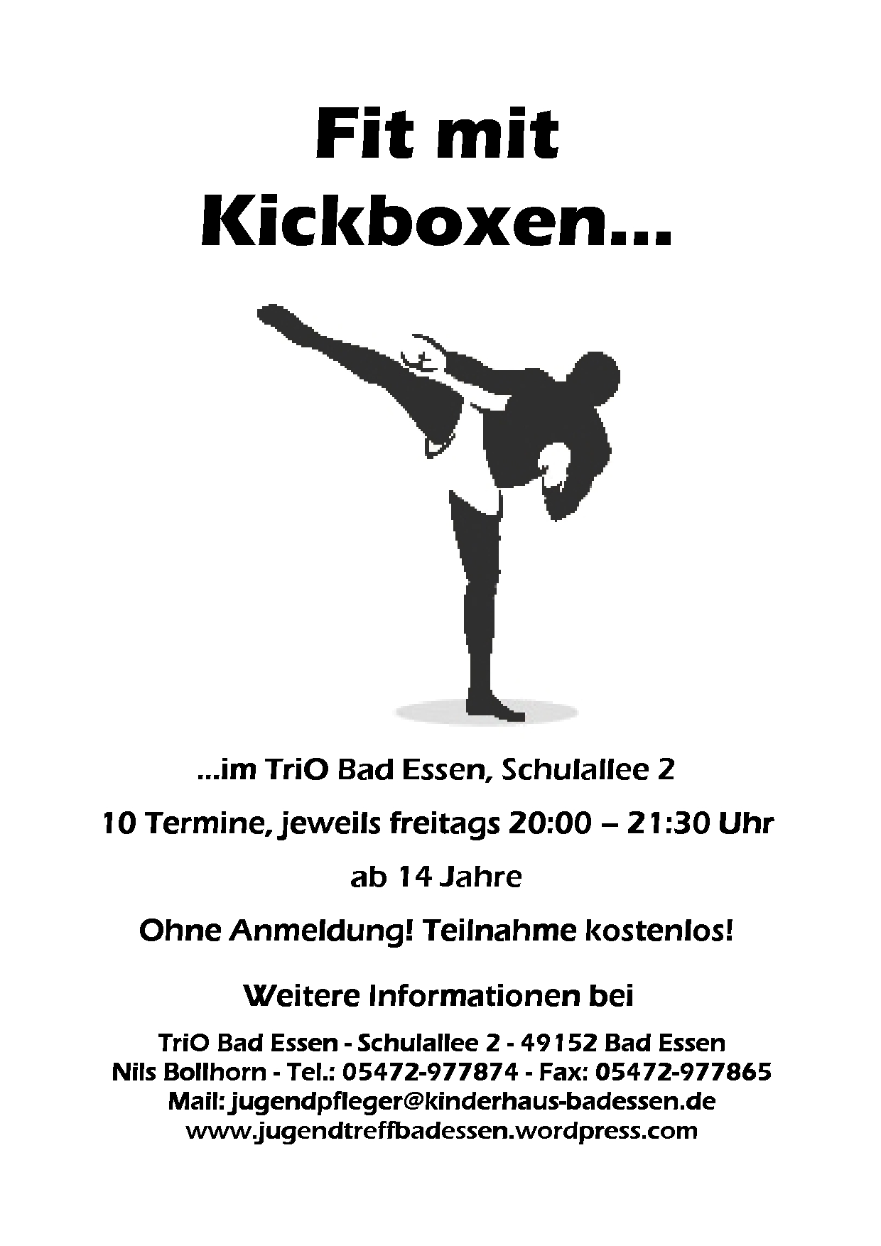 ab freitag, den 18.06.2010 ist es soweit! Das von einigen von sehnlich erwartete Angebot „Fit mit Kickboxen“ findet statt und natürlich bei uns im TriO 😉