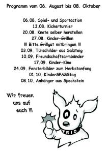 Jugendarbeit, Veranstaltungen Programm Kindertag vom 06.08 bis 08.10 Verfasst von Jugendtreffleiter am 6. August 201010. August 2010 Kindertag im TriO Freitags, 15-17 Uhr Alter: 6-12 Jahre Malen, Basteln, Spass und vieles mehr …! Weiterleiten an: Klick, um auf Facebook zu teilen (Wird in neuem Fenster geöffnet) Facebook Klicke, um auf X zu teilen (Wird in neuem Fenster geöffnet) X Zum Teilen auf MySpace klicken (Wird in neuem Fenster geöffnet) MySpace Klicken zum Ausdrucken (Wird in neuem Fenster geöffnet) Drucken Klicken, um einem Freund einen Link per E-Mail zu senden (Wird in neuem Fenster geöffnet) E-Mail Gefällt mir Wird geladen … Ähnliche Beiträge