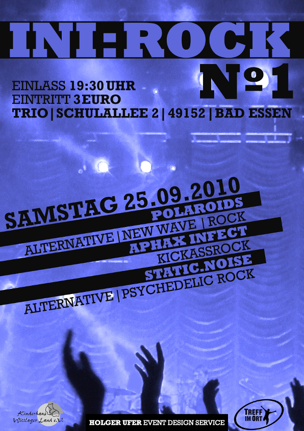 Mit der neuen Konzertreihe Ini:Rock will die Musikinitiative TriO einen festen Bestandteil im Kulturprogramm für Jugendliche etablieren. Etwa alle zwei Monate sollen lokale, regionale und überregionale Bands im Jugendzentrum auftreten. Das Motto: drei Euro, drei Bands! Bei der ersten Veranstaltung am Samstag, 25. September, sind zwei Bands aus dem Grönegau sowie ein lokaler Act dabei. Während die „POLAROIDS“ um Frontfrau Hannah Fiebig auf einen dynamischen Rocksound setzen, der an Bands wie Placebo oder Blink 182 erinnert, beschreiben „Aphax Infect“ ihre Musik als Kickassrock. Die Musik des Localacts „static.noise“ zeichnet sich durch eine Verbindung von alternativem Rock und psychedelischen Elementen aus. Die Konzert können alle Jugendliche ab 14 Jahren besuchen.