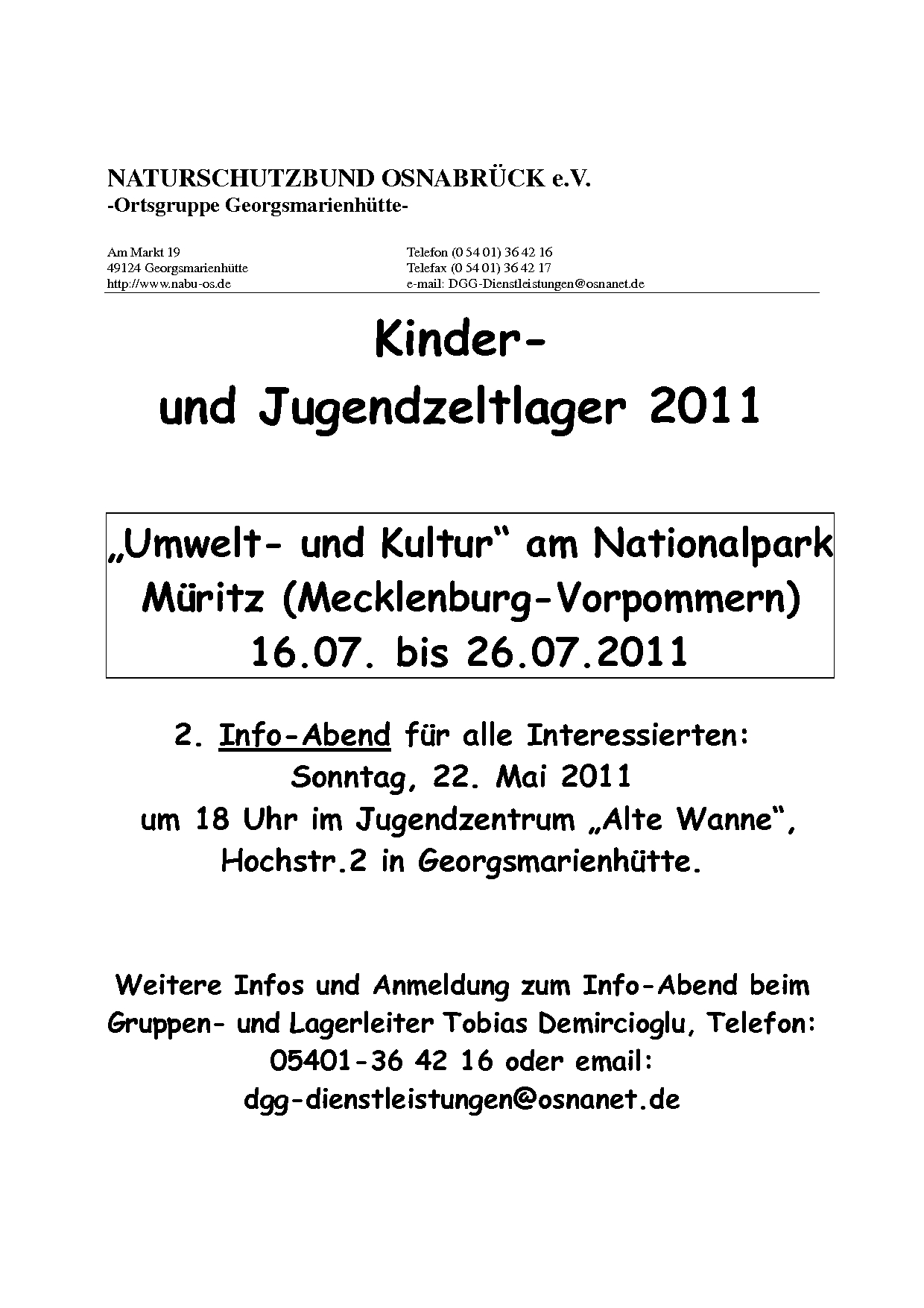 der Naturschutzbund Osnabrück e.V. – Ortsgruppe Georgsmarienhütte bietet in den Sommerfeiren vom 16.07 – 26.07.2011 wieder ein Kinder- und Jugendzeltlager „Umwelt und Kultur“ am Nationalpark Müritz in Mecklenburg-Vorpommern an. Alle weiteren Infos findet ihr auf dem Flyer.
