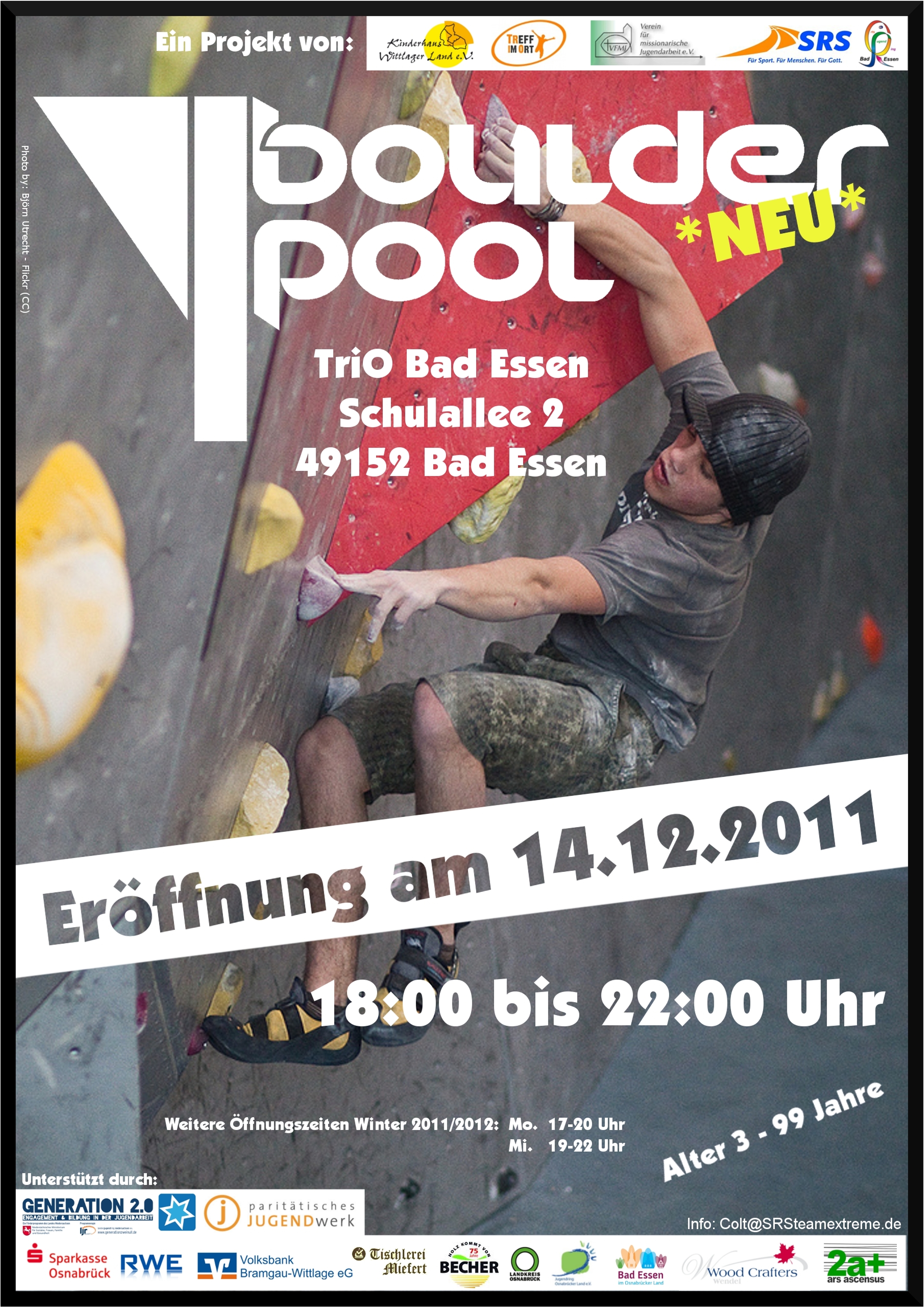Nach fast einem Jahr Planung und Schrauben, Sägen und Hämmern werden die Pforten des Boulder Pool Bad Essen am Mittwoch den 14.12.2011 um 18.00 Uhr eröffnet. Im Dezember 2010 gab es das erste Treffen im Trio mit dem Verein für missionarische Jugendarbeit, SRSteamextreme, dem Ortsjugendring Bad Essen und der Jugendpflege Bad Essen um dieses geniale Projekt zu starten. Mit der erfolgreichen TÜV Abnahme vor einer Woche, kommen wir unseren Eröffnungsziel ganz nahe. Damit wäre der Boulder Pool die erste Boulderhalle im Osnabrücker Raum. Nach der Eröffnung wird der Boulder Pool montags von 17-20 Uhr und mittwochs von 19-22 Uhr geöffnet haben. Dazu planen wir noch für das Frühjahr 2012 einen Boulder Contest. Wir freuen uns mega auf jeden der kommen will. Ebenfalls seid Ihr herzlich Willkommen am 14.12.2011 von 18-22 Uhr zum freien Klettern im Boulder Pool!