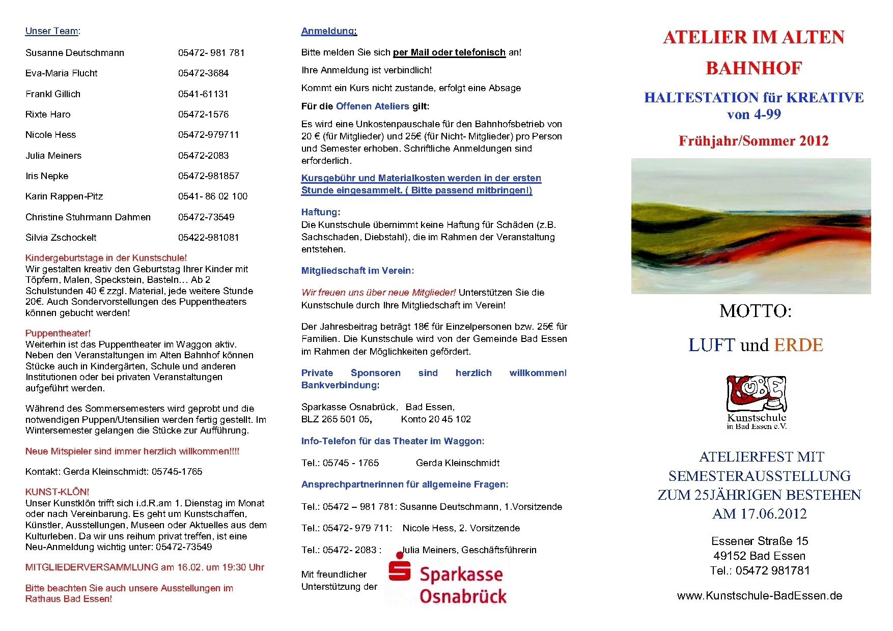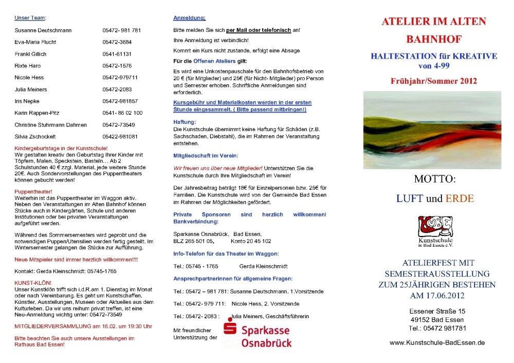 Veranstaltungen Neues Programm der Kunstschule Bad Essen Verfasst von Jugendpflege Bad Essen am 18. Januar 201218. Januar 2012 Das neue Programm der Kunstschule Bad Essen ist da. Alles weiter auf dem Flyer oder unter www.kunstschule-badessen.de 52.322270 8.346750 Weiterleiten an: Klick, um auf Facebook zu teilen (Wird in neuem Fenster geöffnet) Facebook Klicke, um auf X zu teilen (Wird in neuem Fenster geöffnet) X Zum Teilen auf MySpace klicken (Wird in neuem Fenster geöffnet) MySpace Klicken zum Ausdrucken (Wird in neuem Fenster geöffnet) Drucken Klicken, um einem Freund einen Link per E-Mail zu senden (Wird in neuem Fenster geöffnet) E-Mail Gefällt mir Wird geladen … Ähnliche Beiträge
