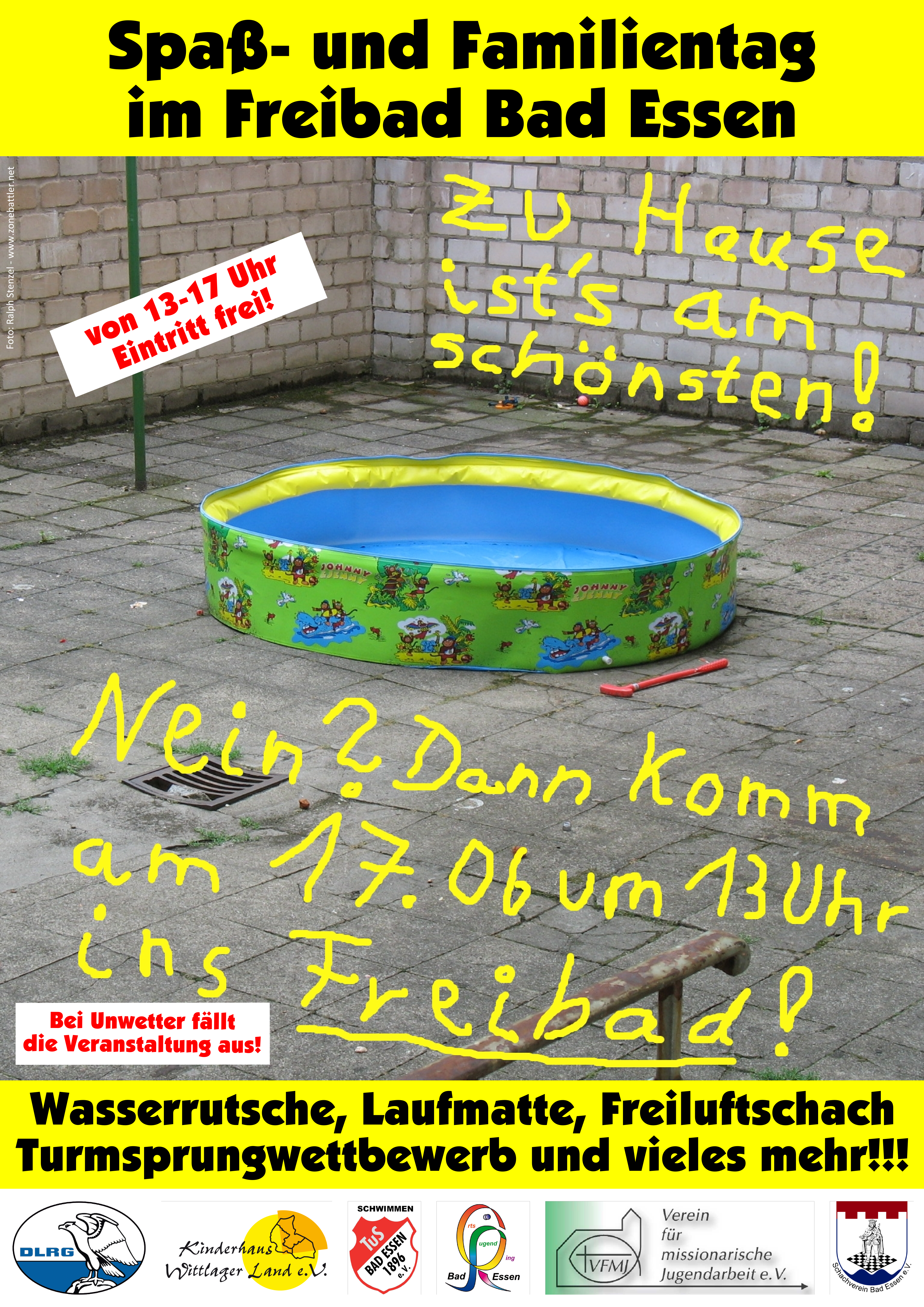 Das Poolparty Lintorf Team hat sich gedacht, was im Hallenbad Lintorf funktioniert, das müsste auch im Freibad Bad Essen klappen! Nun ist es soweit, am Sonntag, den 17.06.2012 findet von 13:00 – 17:30 Uhr der erste Spaß- und Familientag im Freibad Bad Essen statt. Neben der DLRG Obere Hunte, dem VfmJ, dem OJR und der Jugendpflege Bad Essen sind diesmal auch der Schachverein Bad Essen und die Schwimmabteilung des TuS Bad Essen mit im Boot. Also, noch mehr Spaß für euch und es kommt noch besser! An diesem Tag ist der Eintritt ins Freibad von 13:00 bis 17:00 Uhr für Jung und Alt frei!!! Vielen Dank an die Gemeinde Bad Essen. Alles weiter auf dem Flyer.