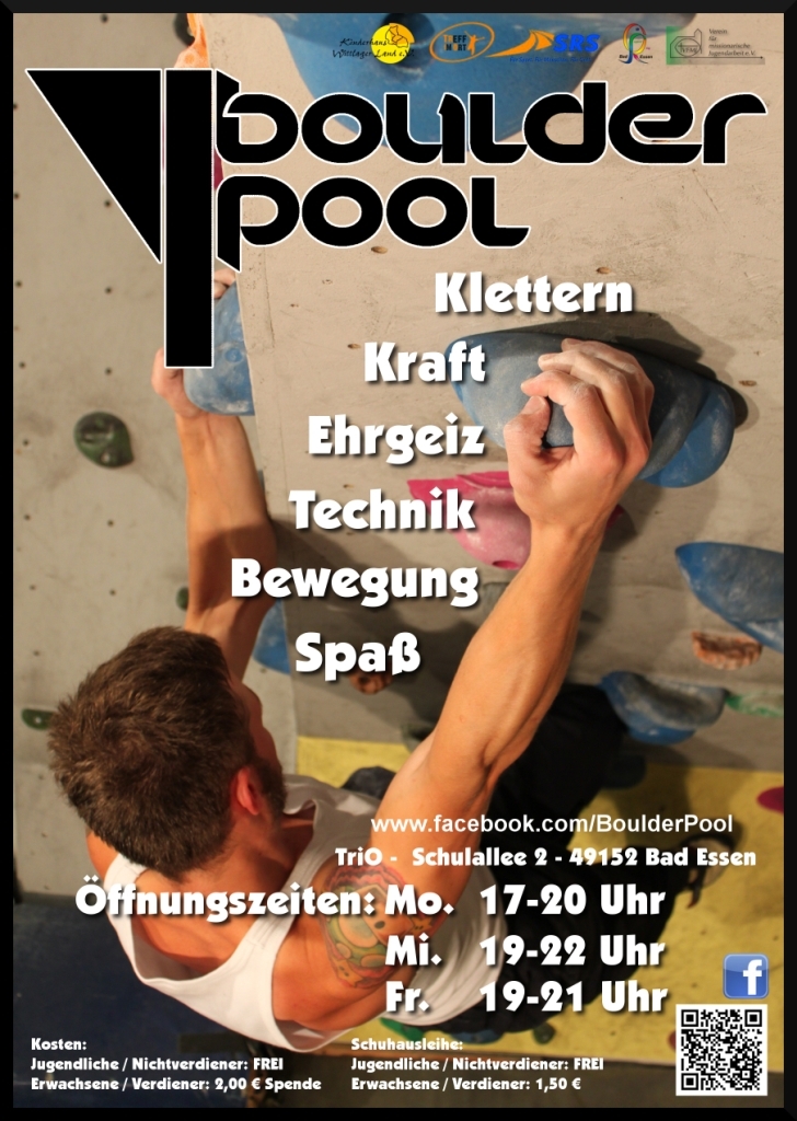 der Boulder Pool Bad Essen hat jetzt auch freitags von 19-21 Uhr geöffnet. Nun ja, das ist nicht wirklich total neu, denn Simon macht das jetzt schon eine Weile, aber bisher Stand das noch nirgends auf einem Flyer. Das hat sich nun geändert. Dank an Jan für Layout und an unser Topmodel Mathias 🙂