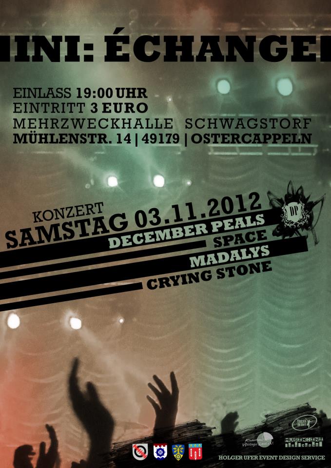 Im Rahmen des jährlichen Austauschs zwischen den Gemeinden Bad Essen, Bohmte und Ostercappeln sowie der französischen Partnergemeinde Bolbec findet in diesem Jahr erstmalig das Konzert Ini:échange in der Mehrzweckhalle in Schwagstorf statt. Zusammen mit der „Musikinitiative Bad Essen“ und dem Partnerschaftsverein „Partnerschaft Bolbec-Wittlage e.V.“ richten die Gemeinden des Altkreises am Samstag, den 03.11., ab 19:00 Uhr diese Veranstaltung aus, bei der 2 französische und 2 deutsche Bands für Unterhaltung sorgen werden. „Madalys“ sind eine 4 köpfige Rockband aus Le Havre und seit 2012 mit ihrer aktuellen Sängerin unterwegs. Trotz einer noch relativ jungen Bandgeschichte haben sie ihren eigenen Stil gefunden, der sich teilweise durch melancholische Texte und durchweg experimentelle Musik auszeichnet. Ebenfalls aus der Normandie kommen „Crying Stone“. Die vier jungen Herren haben nach eigenen Aussagen seit ihrer Gründung im Jahr 2006 schon einige ihrer Träume, wie beispielsweise die Veröffentlichung ihres ersten Albums vor zwei Jahren, verwirklicht. „Space“ aus dem Landkreis Osnabrück bezeichnen ihre Musik als „Short-Fuse-Full-Tilt-Boogie-Rock“ und sind seit 2009 zwischen Münster und dem Ostfriesland unterwegs. Dabei ließen sie es sich nicht nehmen schon einmal das Publikum im Bad Essener Jugendtreff „TriO“ zu begeistern. Als zweite deutsche Band des Abends werden „December Peals“ (Foto) dem Publikum einheizen. Ihr leidenschaftlicher Rock geht direkt nach vorne und das Quintett kann auf eine erfolgreiche Vergangenheit zurückblicken: 3 veröffentlichte EP’s, ein veröffentlichtes Album, Auftritte mit den „Beatsteaks“, den „Donots“ und „New Model Army“ u.v.m.