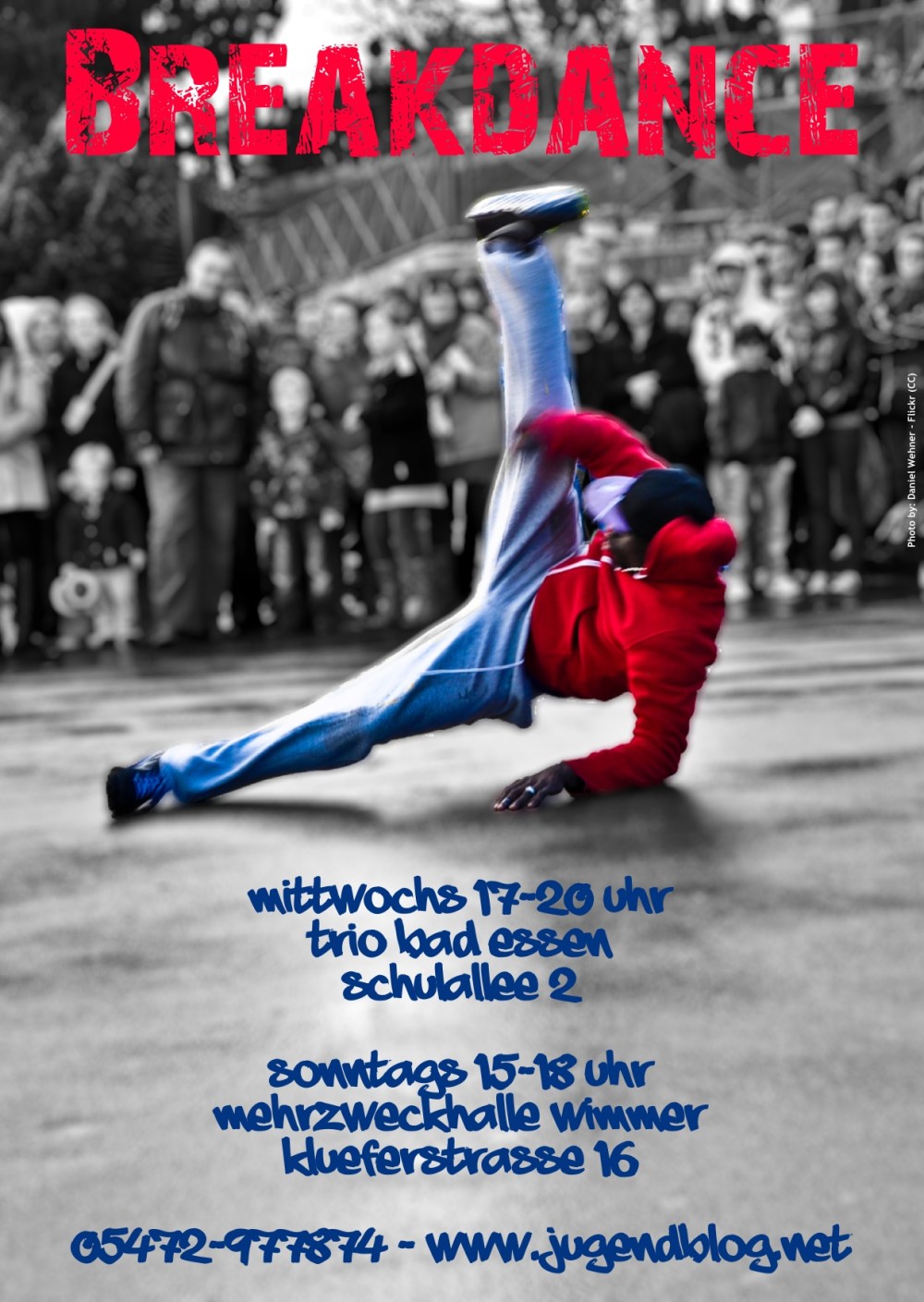 Djeladin „Jerry“ Hafner leitet übrigens eine Breakdancegruppe die sich sonntags in der Mehrzweckhalle in Wimmer und mittwochs im TriO Bad Essen trifft. Die Mittwochtermine finden allerdings nicht regelmäßig statt, da dies von Jerrys Arbeitszeiten abhängt. Wer Lust hat, kann gerne vorbeischauen. Alles weiter auf dem Flyer.
