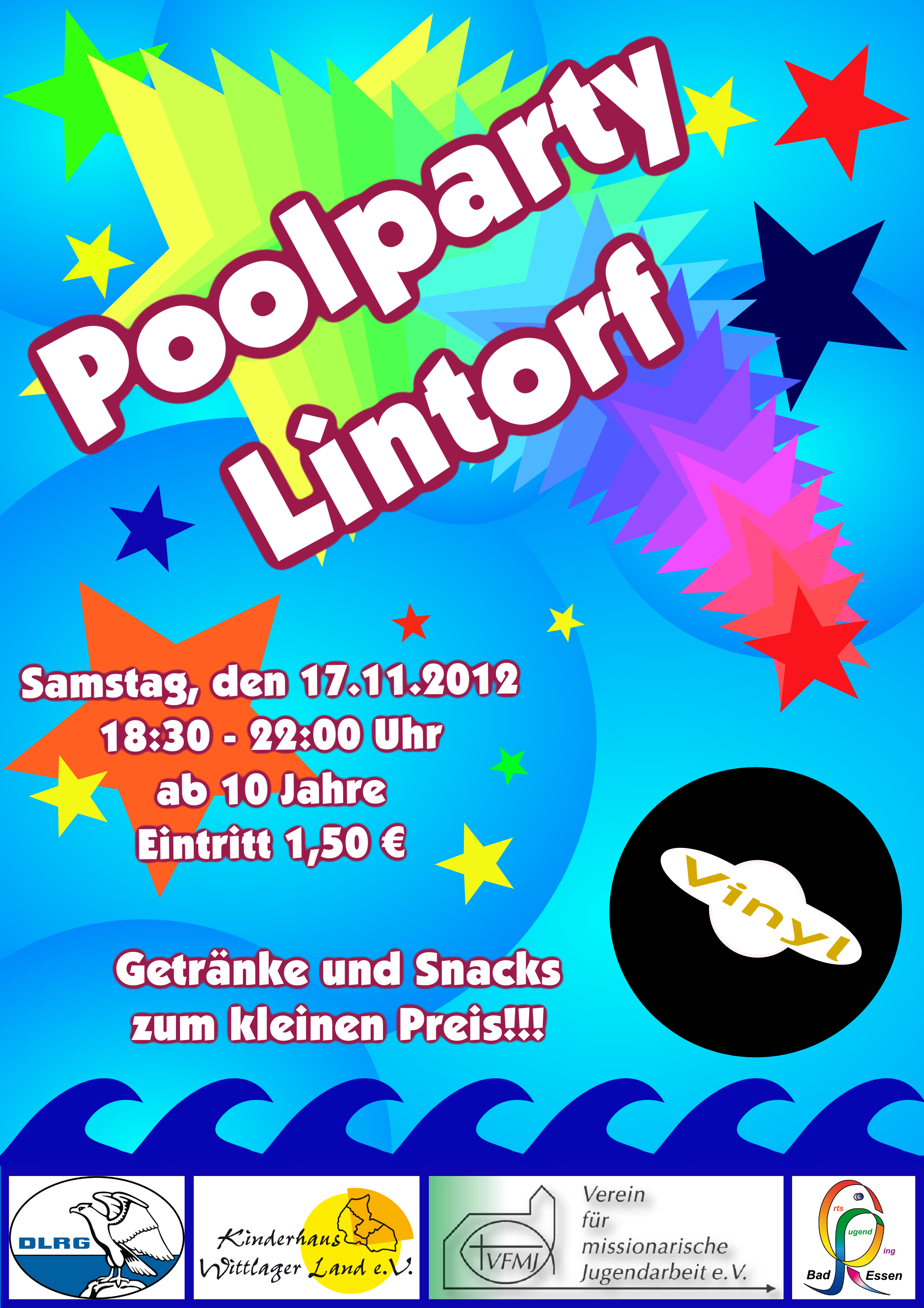 am Samstag, den 17.11.2012 findet von 18:30 – 22:00 Uhr die nächste Poolparty im Hallenbad Lintorf statt. Der Ortsjugendring Bad Essen, der Verein für missionarische Jugendarbeit, die DLRG Obere Hunte und Kinderhaus Wittlager Land e.V. organisieren für euch wieder eine Disko im Hallenbad. Der Eintrittspreis beträgt 1,50 €. Snacks und Getränke sind wie immer zum kleinen Preis erhältlich. Die Poolparty ist für alle Kinder und Jugendliche ab 10 Jahre.
