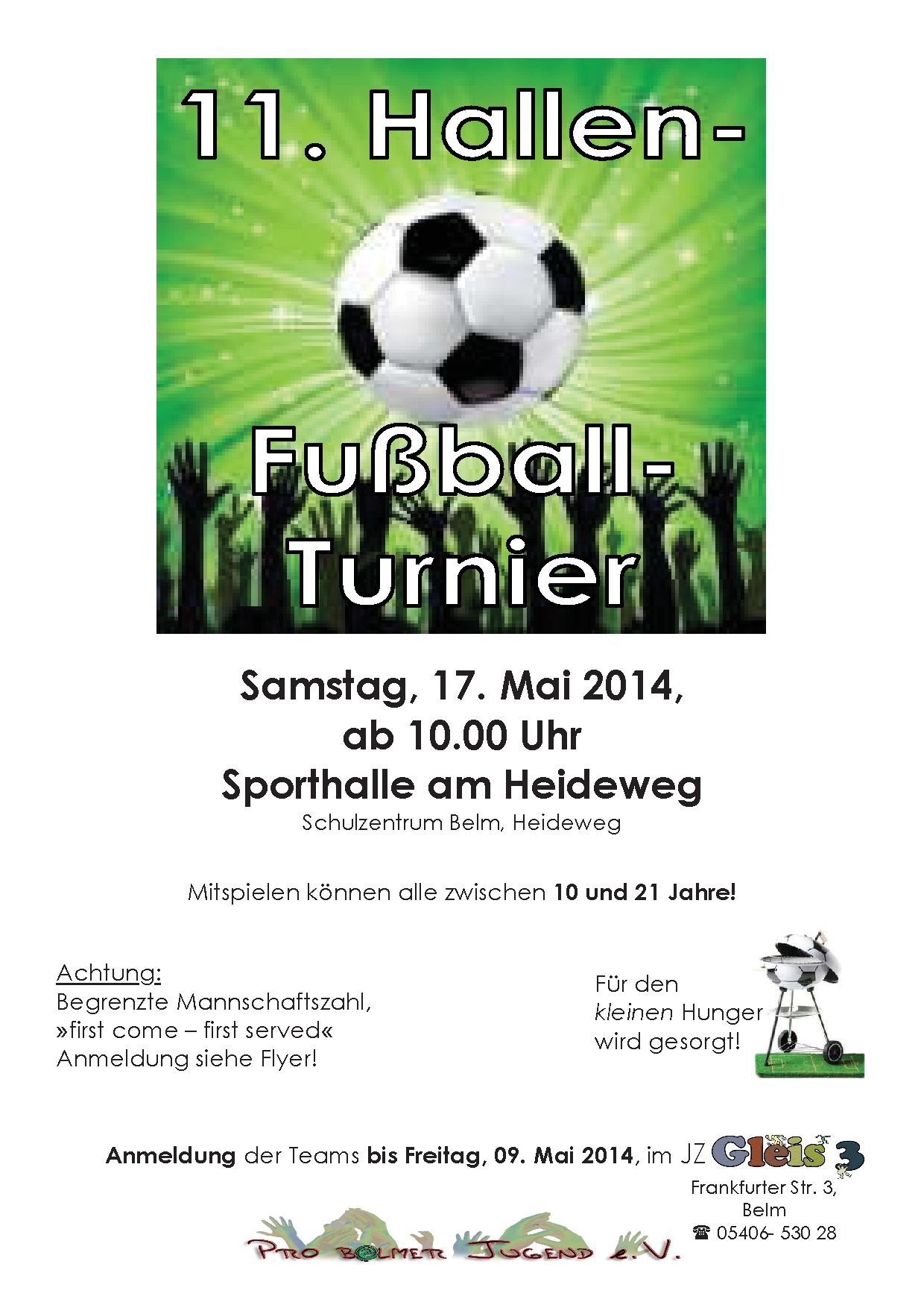 Ich weiß gar nicht mehr, wie oft ich von euch gefragt worden bin, wann denn wieder das Hallen-Fußball-Turnier in Belm stattfindet? Jetzt kann ich antworten, am Samstag, den 17. Mai ist es soweit. Die Anmeldungen nimmt wie immer der Ausrichter Pro Belmer Jugend e.V. bis zum 09. Mai entgegen. Aber, Achtung, die Anzahl der Mannschaften ist begrenzt, also lieber zu früh als zu spät anmelden!