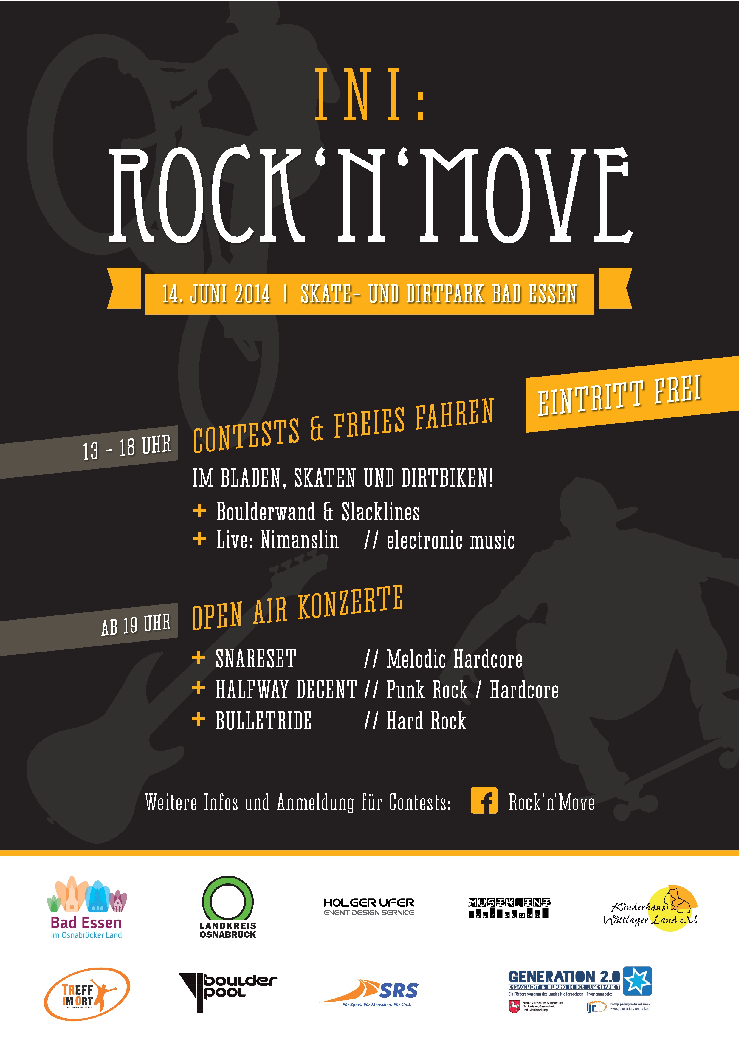 Die Musikinitiative Bad Essen wird in Kooperation mit dem Boulder Pool Bad Essen und den lokalen Vertreter*Innen der Inline-, Skate- sowie Dirtbike-Szene am 14.06.2014 mit Ini:Rock’n’Move ein jugendkulturelles Event der ganz besonderen Art veranstalten.
