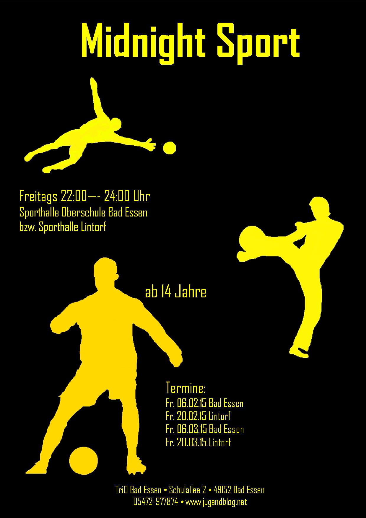 Veranstaltungen Midnight Sport Verfasst von Saskia Kreyenhagen am 28. Januar 201528. Januar 2015 Die neuen Termine für Midnight Sport stehen fest. Kommt einfach mit Sportsachen vorbei!!! Weiterleiten an: Klick, um auf Facebook zu teilen (Wird in neuem Fenster geöffnet) Facebook Klicke, um auf X zu teilen (Wird in neuem Fenster geöffnet) X Zum Teilen auf MySpace klicken (Wird in neuem Fenster geöffnet) MySpace Klicken zum Ausdrucken (Wird in neuem Fenster geöffnet) Drucken Klicken, um einem Freund einen Link per E-Mail zu senden (Wird in neuem Fenster geöffnet) E-Mail Gefällt mir Wird geladen … Ähnliche Beiträge