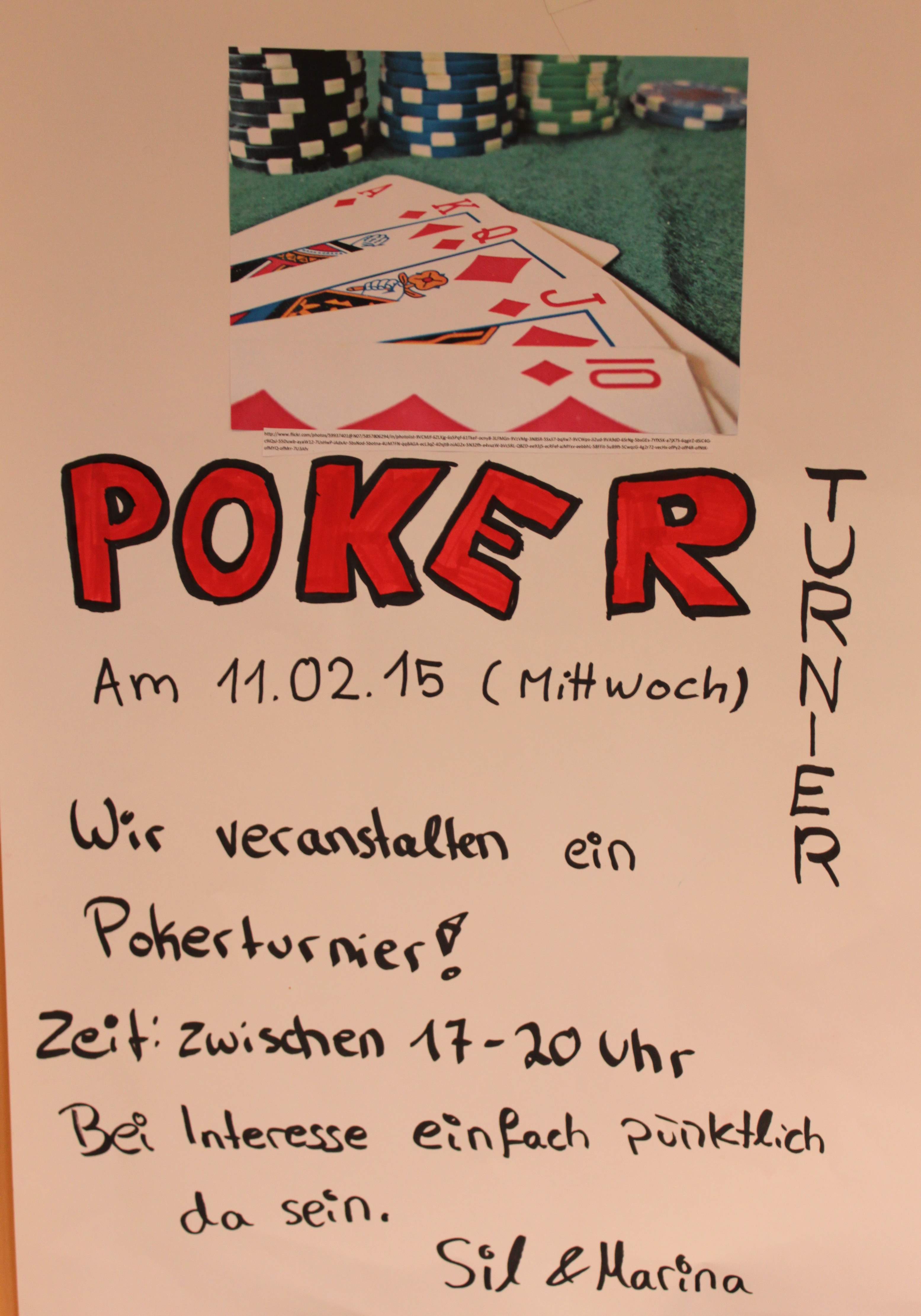 Veranstaltungen Pokerturnier im TriO Verfasst von Jugendtreffleiter am 5. Februar 20155. Februar 2015 Im Rahmen der Jugendöffnung im TriO findet nächsten Mittwoch ein Pokerturnier statt. Wer hat die besten Karten und vor allem wer kann am besten bluffen??? Weiterleiten an: Klick, um auf Facebook zu teilen (Wird in neuem Fenster geöffnet) Facebook Klicke, um auf X zu teilen (Wird in neuem Fenster geöffnet) X Zum Teilen auf MySpace klicken (Wird in neuem Fenster geöffnet) MySpace Klicken zum Ausdrucken (Wird in neuem Fenster geöffnet) Drucken Klicken, um einem Freund einen Link per E-Mail zu senden (Wird in neuem Fenster geöffnet) E-Mail Gefällt mir Wird geladen … Ähnliche Beiträge