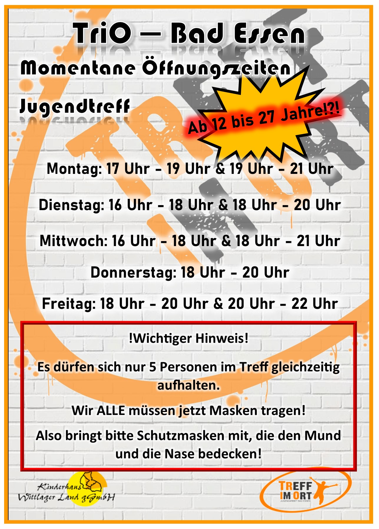 Liebe Leute, es gibt wieder neue Öffnungszeiten im Zuge eines neuen Corona-Spezials. Bitte beachtet: JEDER von 12 bis 27 Jahren darf diese Treffs besuchen. Achtet bitte in dieser schwierigen Zeit auf euch und auf andere. Damit gemeint: Kommt bitte NICHT zum Treff falls ihr euch krank fühlt. Bis demnächst, wir freuen uns auf euch! Euer TriO-Team.