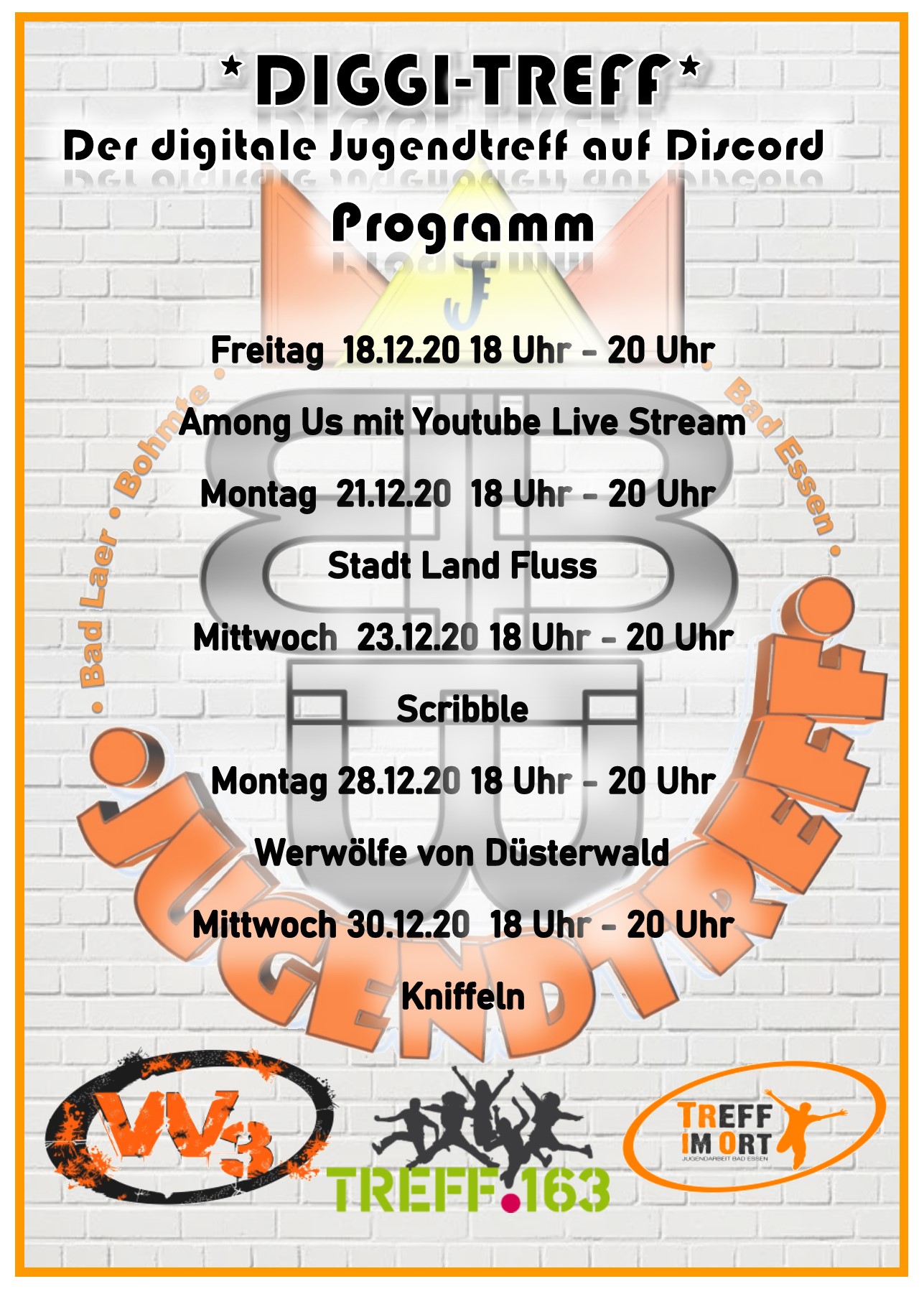Um auch weiterhin für euch ansprechbar zu sein, starten wir nahtlos den Onlinetreff am Freitag! Auch zwischen den Feiertagen sind wir (TriO, Treff. 163 und W3) für euch da, um zu CHATTEN, ZOCKEN und zu CHILLEN!