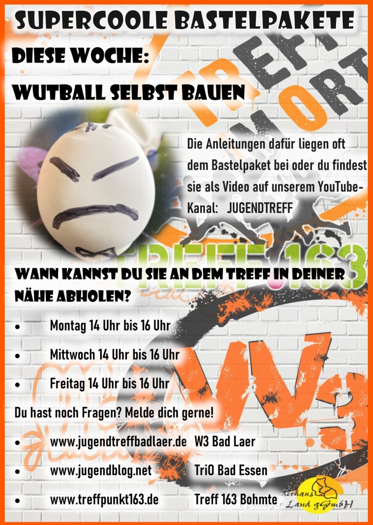 Diese Woche regen wir uns nicht mehr auf, sondern bauen uns einen Wutball. Die Jugendpflege schenkt euch dazu wieder ein Bastelpaket mit Anleitung.