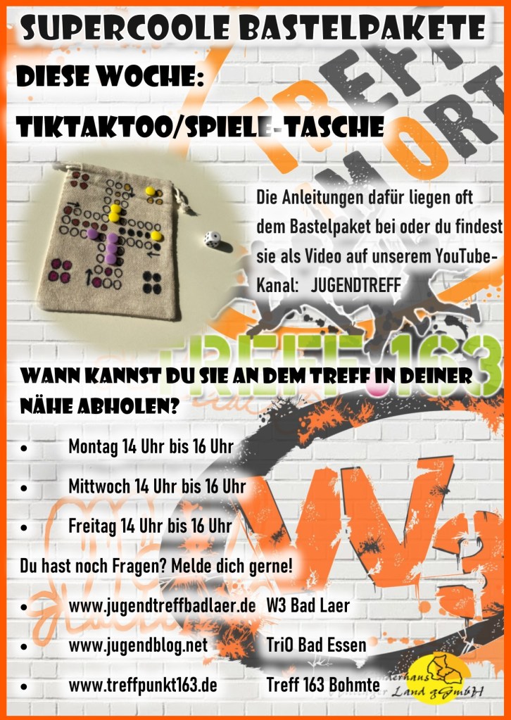 Diese Woche wollen beugen wir der Langeweile in den Osterferien vor und bauen eine Spiel, das zugleich eine Tasche ist… Die Jugendpflege schenkt euch dazu wieder ein Bastelpaket mit Anleitung.