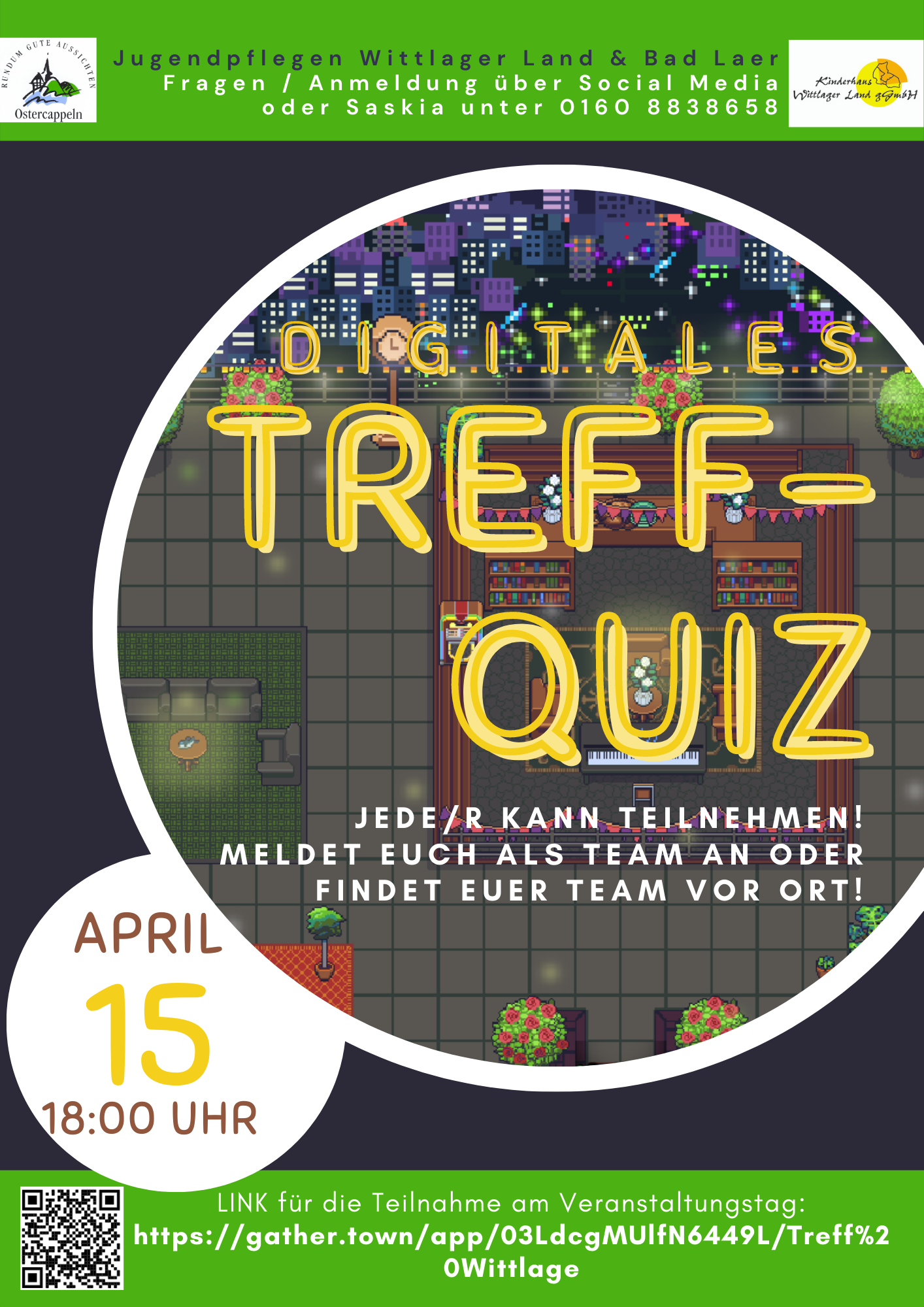 Das große Digitale Treff-Quiz geht in die dritte Runde. Wenn auch du mitmachen, Spaß haben und vielleicht sogar gewinnen willst, komm am 15. April nach Gathertown, unserem Online-Treffpunkt.