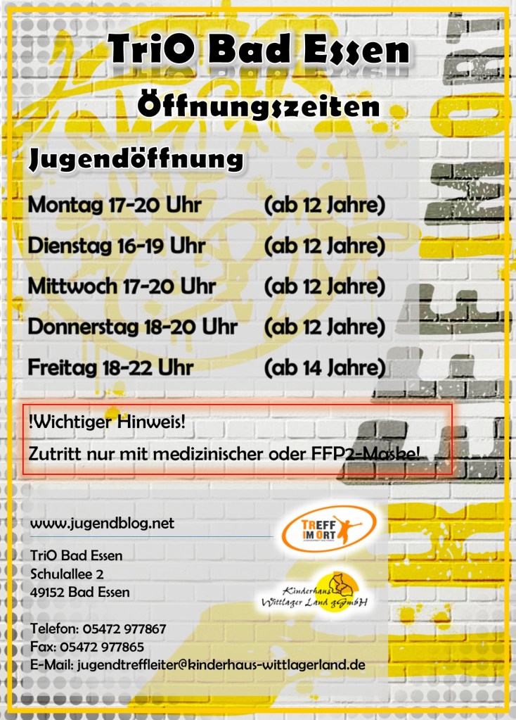 Wir zurück aus dem Ferienpass und wir haben gute Neuigkeiten! Ab sofort sind unsere herkömmlichen Öffnungszeiten wieder aktuell. Somit sind wir wieder mit dem Jugendtreff von montags bis freitags für euch da.