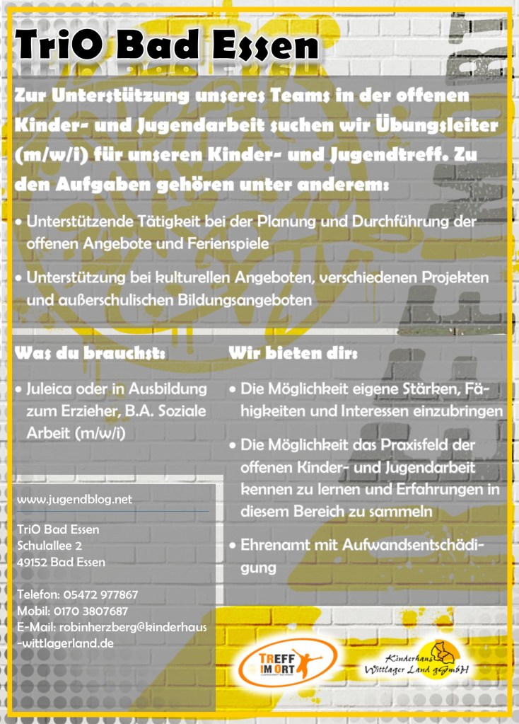 Veranstaltungen Wir suchen dich! Verfasst von Rob am 21. September 2021 Zur Unterstützung unseres Teams in der offenen Kinder- und Jugendarbeit suchen wir Übungsleiter (m/w/i) für unsere Kinder- und Jugendtreffs. Weiterleiten an: Auf Facebook teilen (Wird in neuem Fenster geöffnet) Facebook Auf X teilen (Wird in neuem Fenster geöffnet) X Auf MySpace teilen (Wird in neuem Fenster geöffnet) MySpace Drucken (Wird in neuem Fenster geöffnet) Drucken Einen Link per E-Mail an einen Freund senden (Wird in neuem Fenster geöffnet) E-Mail Gefällt mir Wird geladen … Ähnliche Beiträge