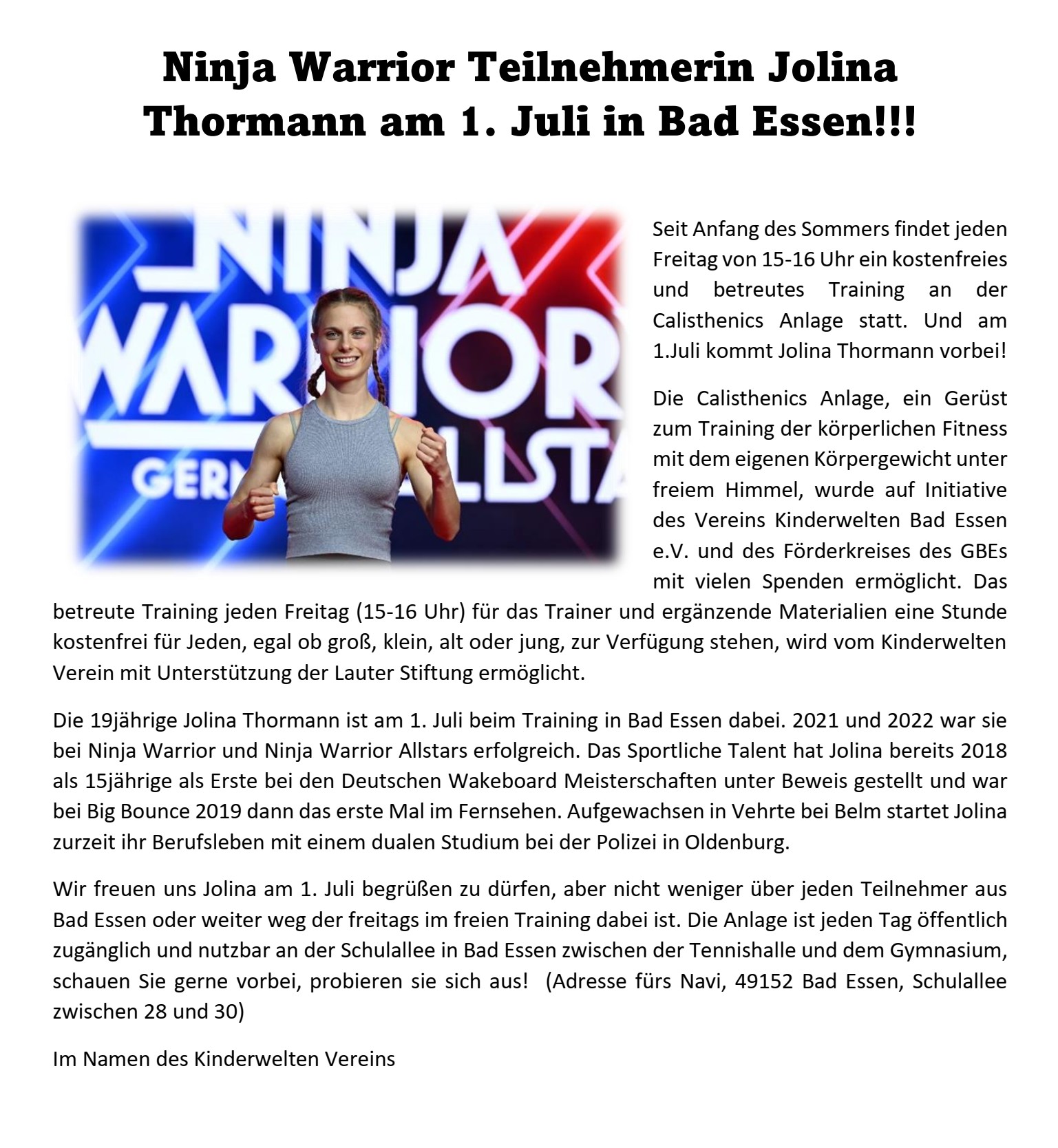 Die 19jährige Jolina Thormann ist am 1. Juli beim Training in Bad Essen dabei. 2021 und 2022 war sie bei Ninja Warrior und Ninja Warrior Allstars erfolgreich. Das Sportliche Talent hat Jolina bereits 2018 als 15jährige als Erste bei den Deutschen Wakeboard Meisterschaften unter Beweis gestellt und war bei Big Bounce 2019 dann das erste Mal im Fernsehen. Aufgewachsen in Vehrte bei Belm startet Jolina zurzeit ihr Berufsleben mit einem dualen Studium bei der Polizei in Oldenburg.Wir freuen uns Jolina am 1. Juli begrüßen zu dürfen, aber nicht weniger über jeden Teilnehmer aus Bad Essen oder weiter weg der freitags im freien Training dabei ist. Die Anlage ist jeden Tag öffentlich zugänglich und nutzbar an der Schulallee in Bad Essen zwischen der Tennishalle und dem Gymnasium, schauen Sie gerne vorbei, probieren sie sich aus! (Adresse fürs Navi, 49152 Bad Essen, Schulallee zwischen 28 und 30)