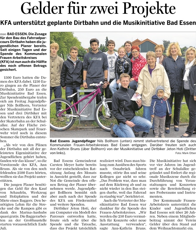 03.07.2013 – KFA unterstützt geplante Dirtbahn und die Musikinitiative Bad Essen